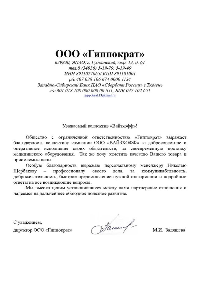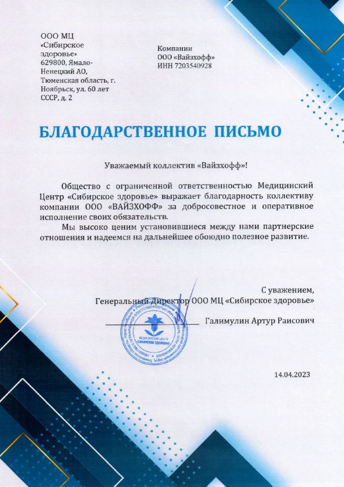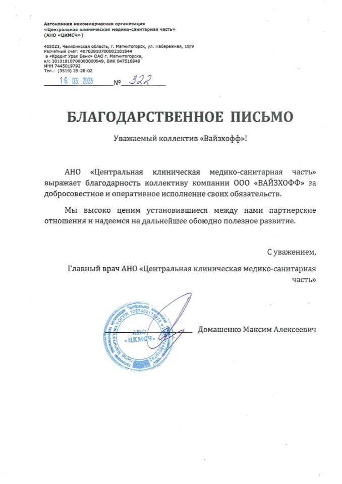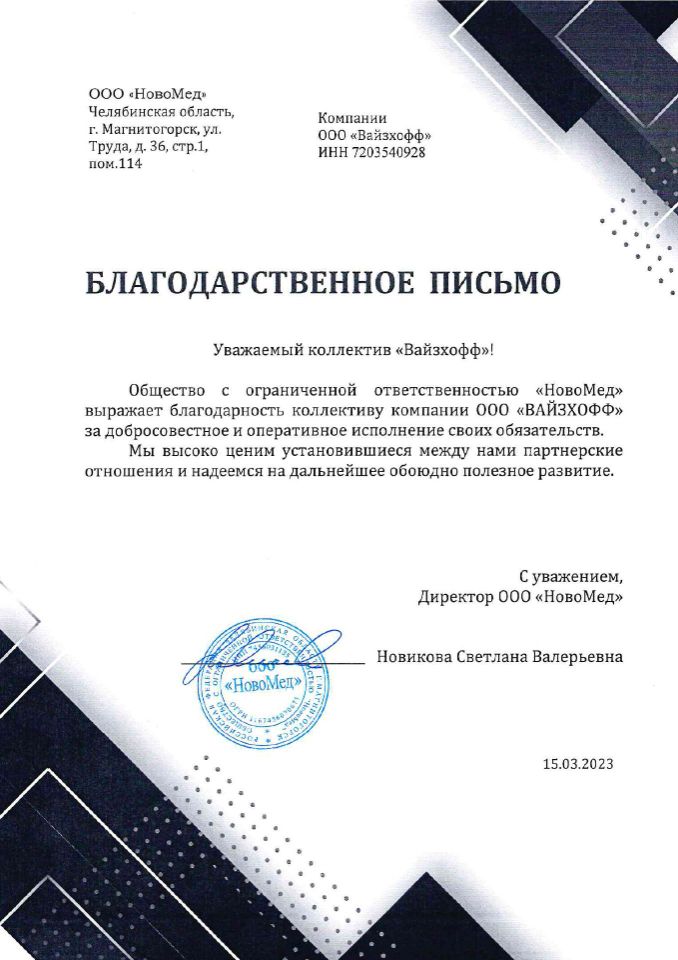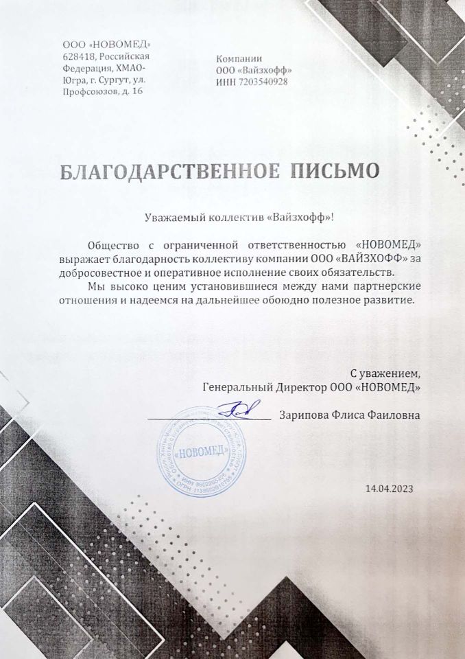 «ВАЙЗХОФФ» – динамично развивающаяся компания, основанная в рамках современной модели вертикальной интеграции. Компания осуществляет комплексную логистику на территорию РФ и стран СНГ медицинского оборудования, как с завода-изготовителя, так и бывшего в употреблении предварительно убедившись в их качестве, а также расходные материалы для удовлетворения широкого перечня медицинских потребностей.