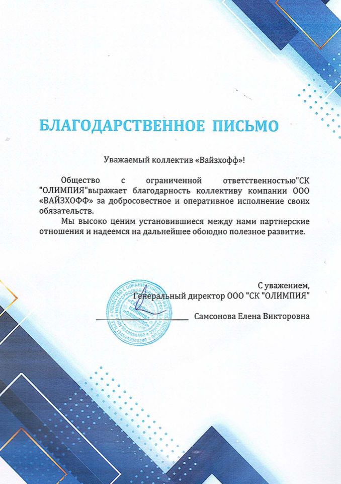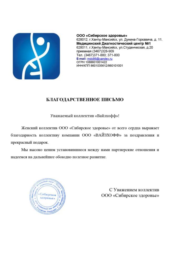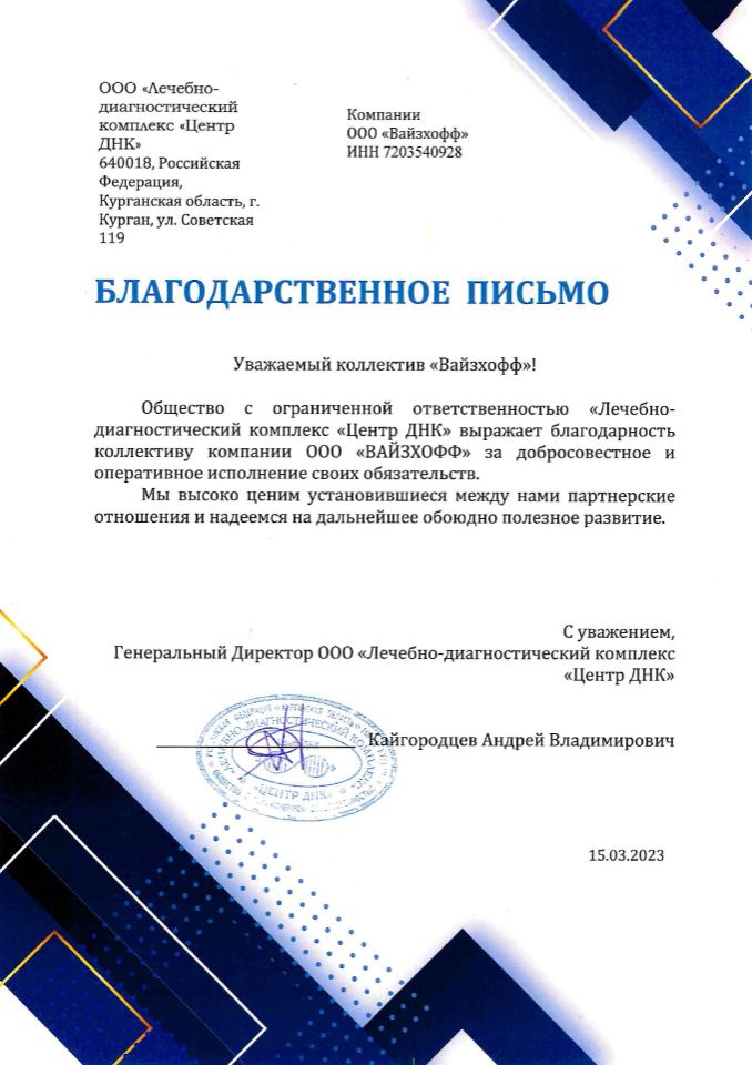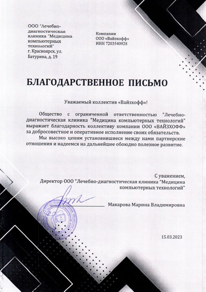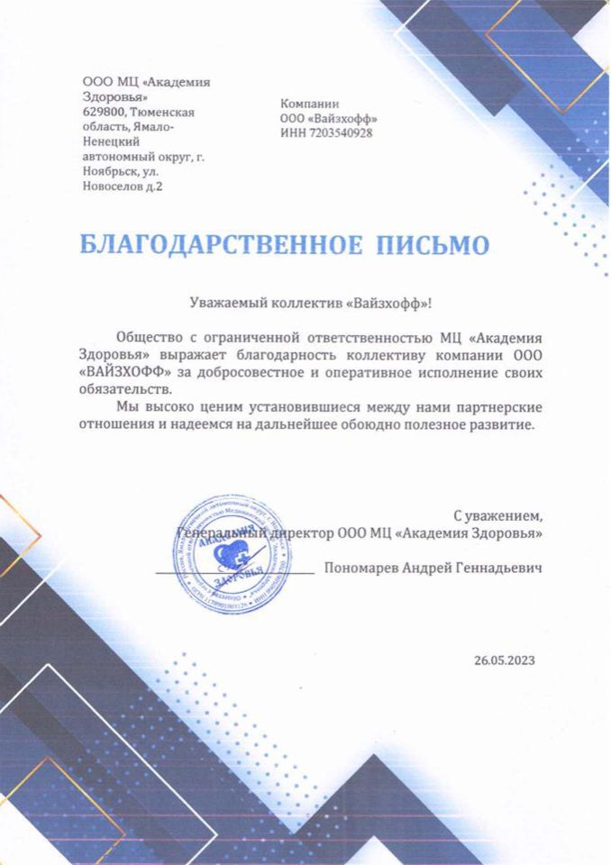 «ВАЙЗХОФФ» – динамично развивающаяся компания, основанная в рамках современной модели вертикальной интеграции. Компания осуществляет комплексную логистику на территорию РФ и стран СНГ медицинского оборудования, как с завода-изготовителя, так и бывшего в употреблении предварительно убедившись в их качестве, а также расходные материалы для удовлетворения широкого перечня медицинских потребностей.